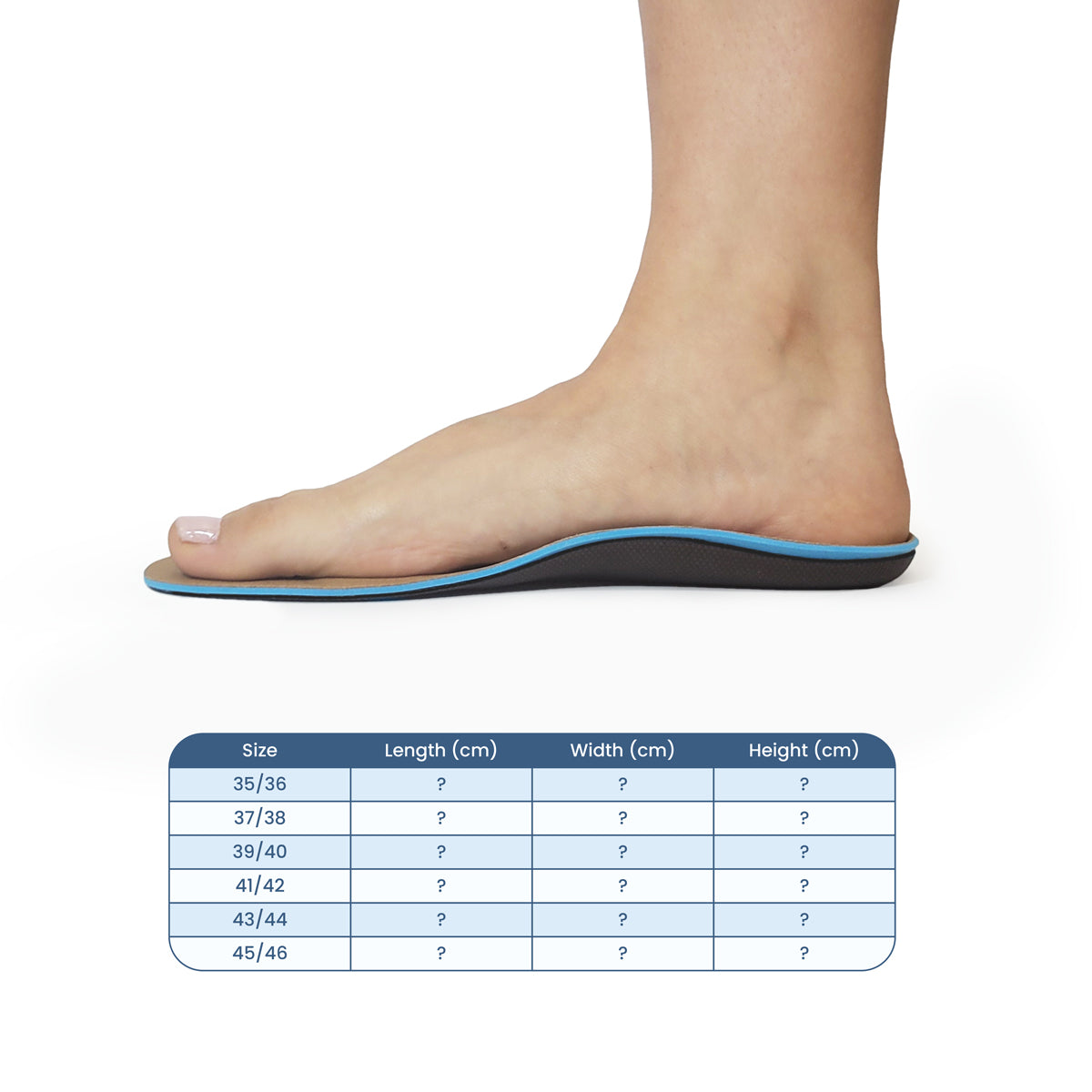 Plantillas moldeadas con almohadilla metatarsal de confort y metatarso para la elevación del arco transverso. Combina materiales de estructuración con elementos en látex blando (20-25º Asker C), microuretano y base antideslizante.