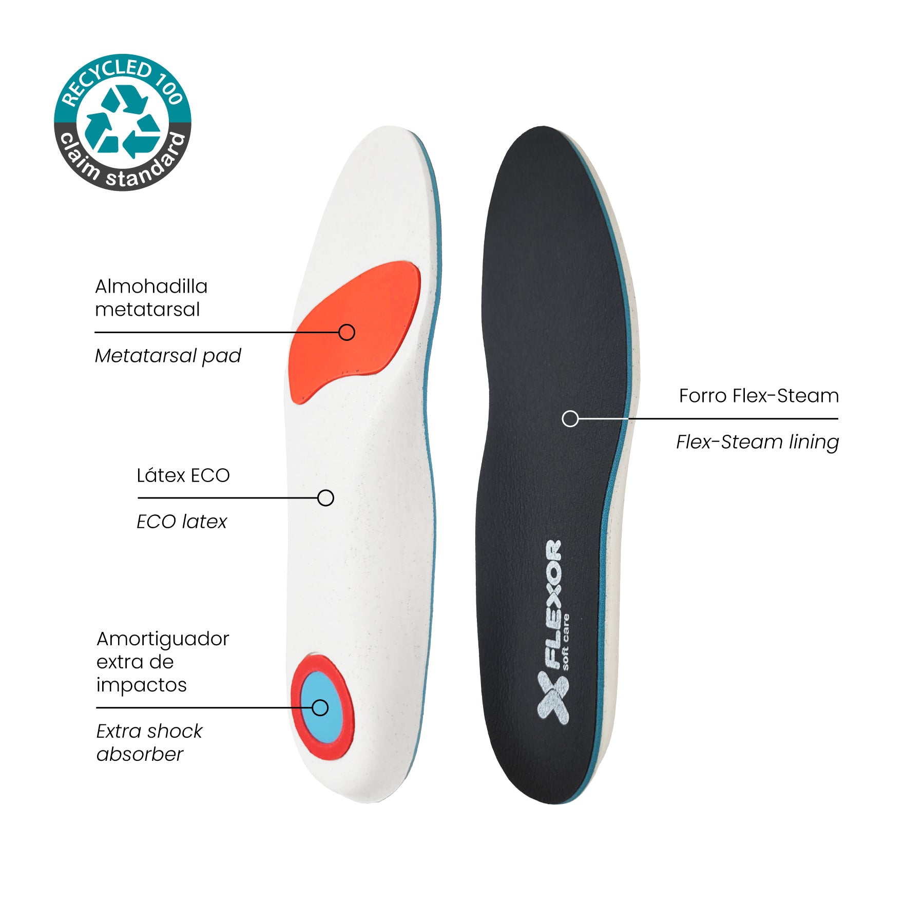 - 🦶 Absorción de impactos: Cada paso cuenta con la tecnología de absorción de impactos de Flexor. Los botones en el talón amortiguan y distribuyen la presión, aliviando la fatiga muscular y mejorando tu bienestar diario