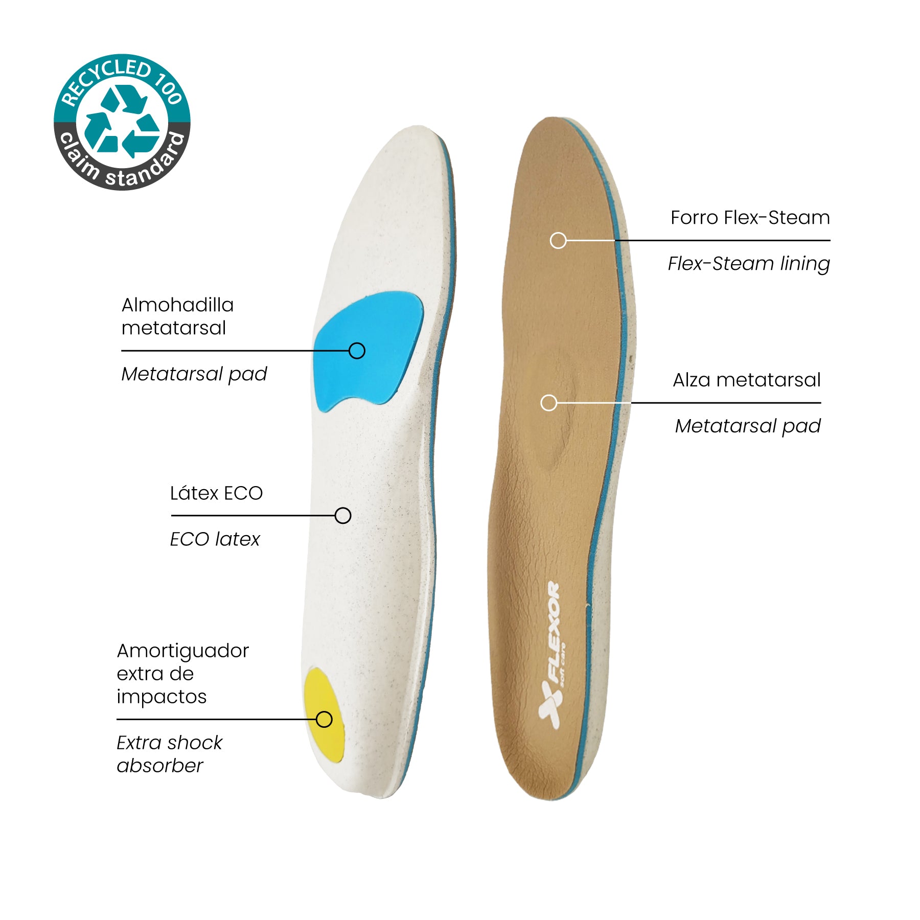 - 🦶 Absorción de impactos: Cada paso cuenta con la tecnología de absorción de impactos de Flexor. Los botones en el talón amortiguan y distribuyen la presión, aliviando la fatiga muscular y mejorando tu bienestar diario